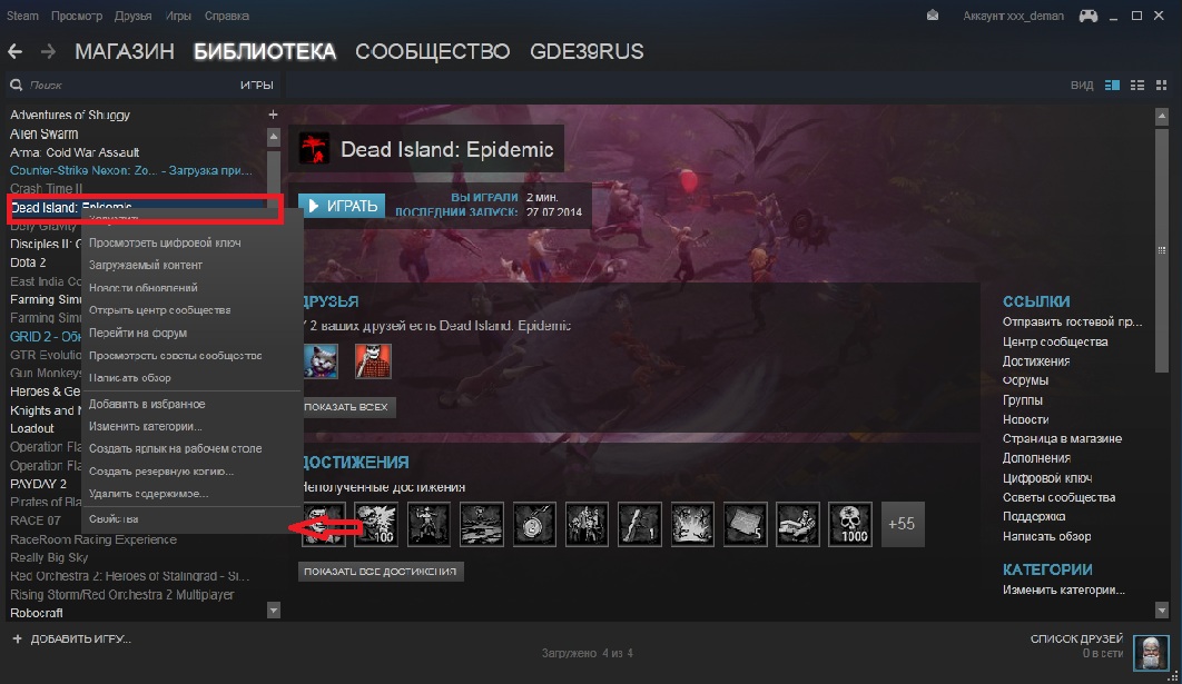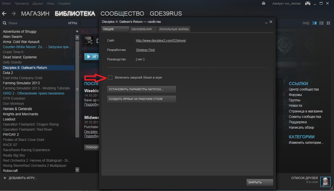 5. Через библиотеку Steam зайдите в свойства игры и снимите галочку с “Включить оверлей Steam в игре”. (пкм на название игры, выбираем свойства, и там находим этот пункт.