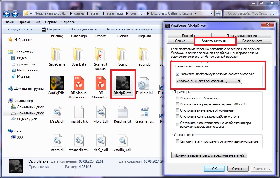 Теперь можно закрыть окно свойств и повторить запуск Disciples II. Если должного эффекта добиться не удалось, переходите к следующим методам, комбинируя их со включенным режимом совместимости.