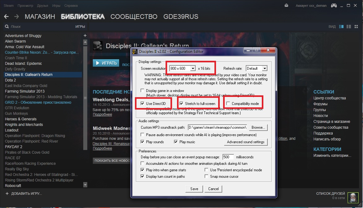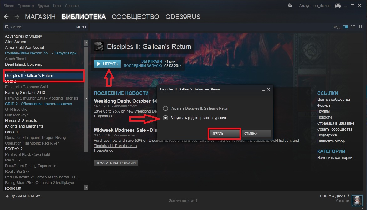 Запустите Disciples II через Steam и в появившемся диалоговом окне (запуск игры или запуск конфигураций) выбрать “Запуск конфигураций”.