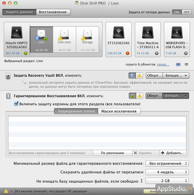 - Защита от случайной перезаписи удаленных файлов: любой диск в Disk Drill можно защитить от записи файлов, нажав на кнопку Protect (функция Recovery Vault)