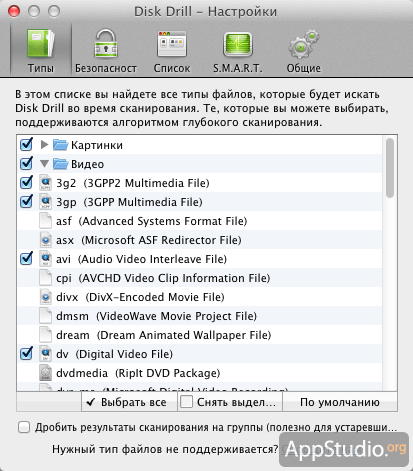 Меню настроек Disk Drill Pro очень простое и содержит 5 вкладок с минимумом настроек, расположенных в них. Среди опций можно отметить возможность выбора тех или иных типов файлов, которые будет искать приложение во время сканирования, задание мастер-пароля, ограничивающего несанкционированный доступ к важным функциям программы, работу со S.M.A.R.T. параметрами дисков. В целом, пользователь даже может и не заглядывать в данное меню, так как Disk Drill Pro отлично работает и без дополнительных настроек.