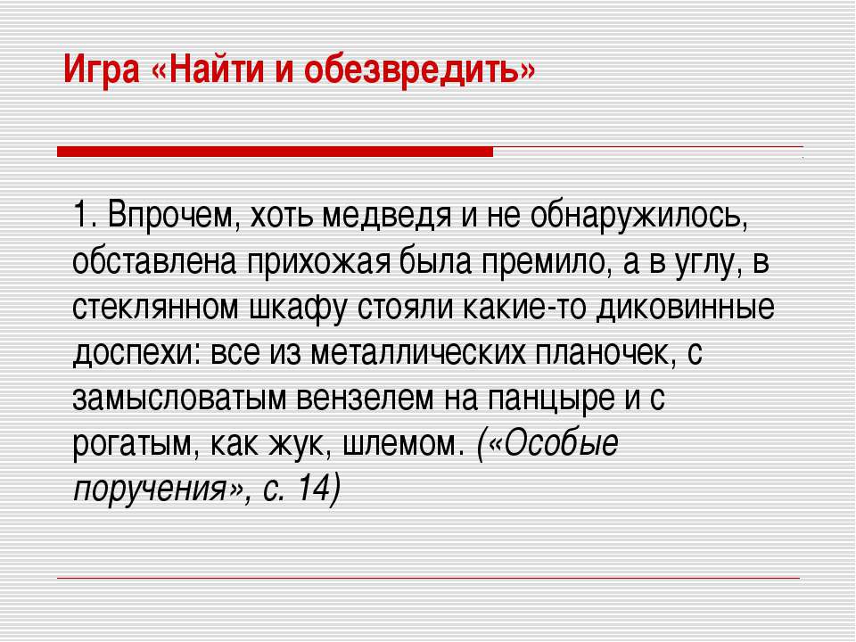 Текст слайда: Игра «Найти и обезвредить» 1. Впрочем, хоть медведя и не обнаружилось, обставлена прихожая была премило, а в углу, в стеклянном шкафу стояли какие-то диковинные доспехи: все из металлических планочек, с замысловатым вензелем на панцыре и с рогатым, как жук, шлемом. («Особые поручения», с. 14)