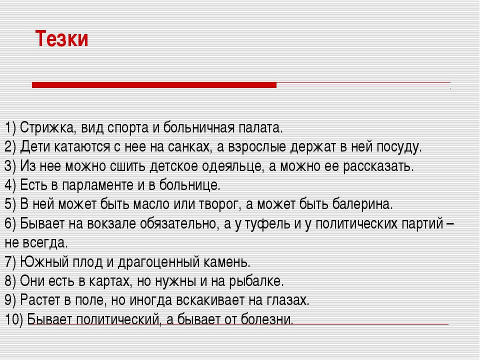 Текст слайда: Тезки 1) Стрижка, вид спорта и больничная палата. 2) Дети катаются с нее на санках, а взрослые держат в ней посуду. 3) Из нее можно сшить детское одеяльце, а можно ее рассказать. 4) Есть в парламенте и в больнице. 5) В ней может быть масло или творог, а может быть балерина. 6) Бывает на вокзале обязательно, а у туфель и у политических партий – не всегда. 7) Южный плод и драгоценный камень.