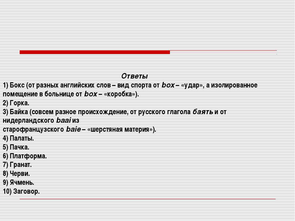 Текст слайда: Ответы 1) Бокс (от разных английских слов – вид спорта от box – «удар», а изолированное помещение в больнице от box – «коробка»). 2) Горка. 3) Байка (совсем разное происхождение, от русского глагола баять и от нидерландского baai из старофранцузского baie – «шерстяная материя»). 4) Палаты. 5) Пачка. 6) Платформа. 7) Гранат.