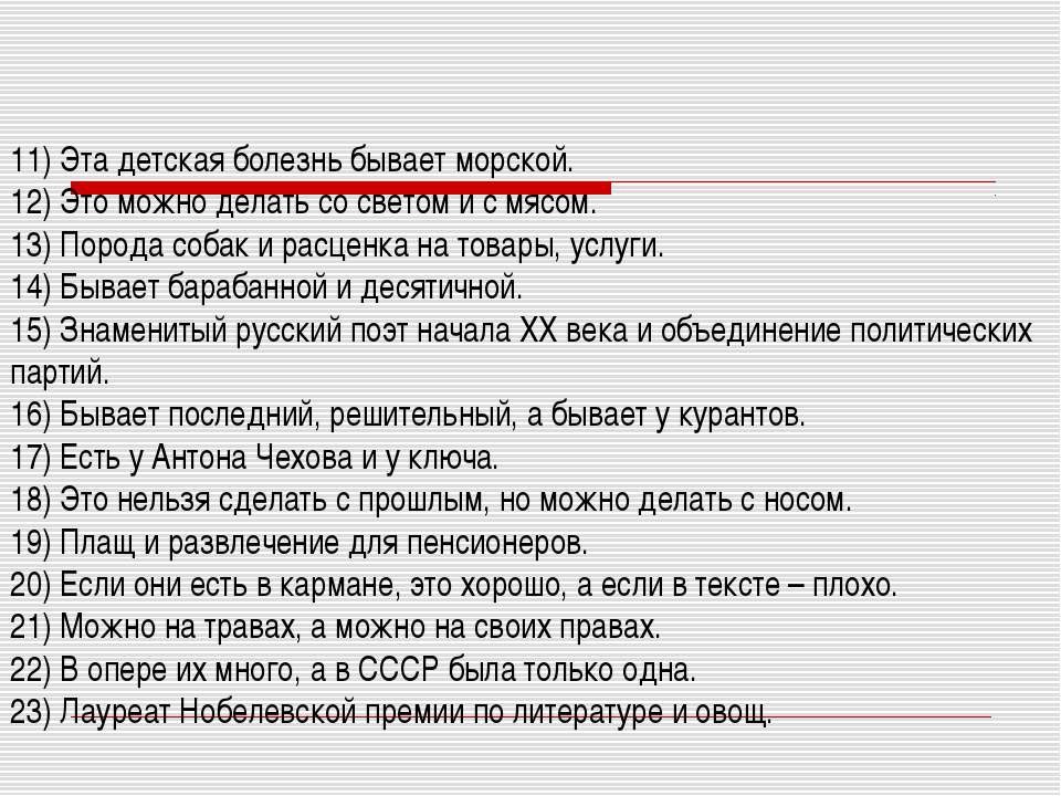 Текст слайда: 11) Эта детская болезнь бывает морской. 12) Это можно делать со светом и с мясом. 13) Порода собак и расценка на товары, услуги. 14) Бывает барабанной и десятичной. 15) Знаменитый русский поэт начала XX века и объединение политических партий. 16) Бывает последний, решительный, а бывает у курантов. 17) Есть у Антона Чехова и у ключа. 18) Это нельзя сделать с прошлым, но можно делать с носом. 19) Плащ и развлечение для пенсионеров. 20) Если они есть в кармане, это хорошо, а если в тексте – плохо. 21) Можно на травах, а можно на своих правах. 22) В опере их много, а в СССР была только одна. 23) Лауреат Нобелевской премии по литературе и овощ.