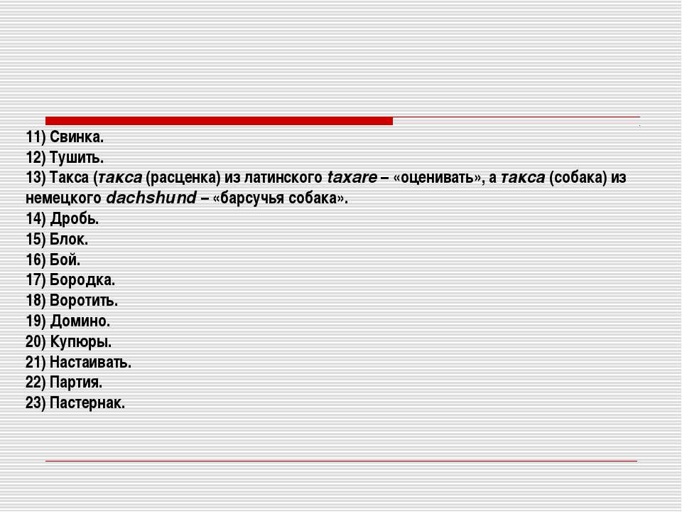Текст слайда: 11) Свинка. 12) Тушить. 13) Такса (такса (расценка) из латинского taxare – «оценивать», а такса (собака) из немецкого dachshund – «барсучья собака». 14) Дробь. 15) Блок. 16) Бой. 17) Бородка. 18) Воротить. 19) Домино. 20) Купюры. 21) Настаивать. 22) Партия. 23) Пастернак.