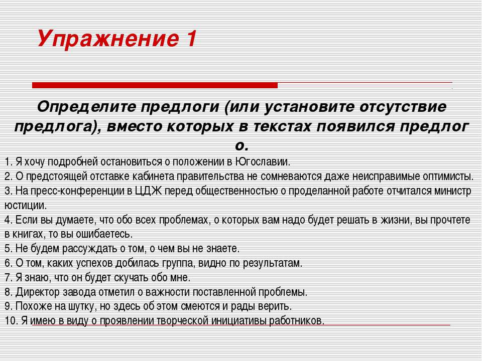 Упражнение 1 Определите предлоги (или установите отсутствие предлога), вместо которых в текстах появился предлог о. 1. Я хочу подробней остановиться о положении в Югославии. 2. О предстоящей отставке кабинета правительства не сомневаются даже неисправимые оптимисты. 3. На пресс-конференции в ЦДЖ перед общественностью о проделанной работе отчитался министр юстиции. 4. Если вы думаете, что обо всех проблемах, о которых вам надо будет решать в жизни, вы прочтете в книгах, то вы ошибаетесь. 5. Не будем рассуждать о том, о чем вы не знаете. 6. О том, каких успехов добилась группа, видно по результатам. 7. Я знаю, что он будет скучать обо мне. 8. Директор завода отметил о важности поставленной проблемы. 9. Похоже на шутку, но здесь об этом смеются и рады верить. 10. Я имею в виду о проявлении творческой инициативы работников.