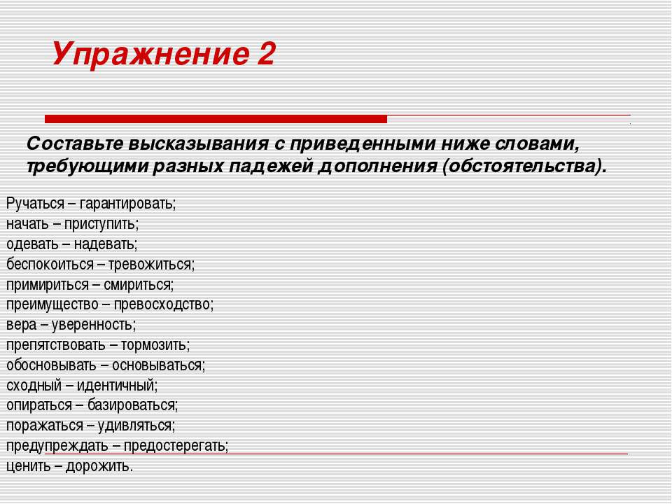 Упражнение 2 Составьте высказывания с приведенными ниже словами, требующими разных падежей дополнения (обстоятельства). Ручаться – гарантировать; начать – приступить; одевать – надевать; беспокоиться – тревожиться; примириться – смириться; преимущество – превосходство; вера – уверенность; препятствовать – тормозить; обосновывать – основываться; сходный – идентичный; опираться – базироваться; поражаться – удивляться; предупреждать – предостерегать; ценить – дорожить.