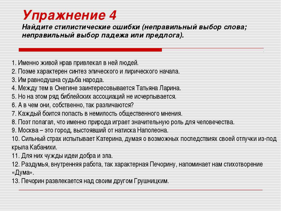 Текст слайда: Упражнение 4 Найдите стилистические ошибки (неправильный выбор слова; неправильный выбор падежа или предлога). 1. Именно живой нрав привлекал в ней людей. 2. Поэме характерен синтез эпического и лирического начала. 3. Им равнодушна судьба народа. 4. Между тем в Онегине заинтересовывается Татьяна Ларина. 5. Но на этом ряд библейских ассоциаций не исчерпывается. 6. А в чем они, собственно, так различаются? 7. Каждый боится попасть в немилость общественного мнения. 8. Поэт полагал, что именно природа играет значительную роль для человечества. 9. Москва – это город, выстоявший от натиска Наполеона. 10. Сильный страх испытывает Катерина, думая о возможных последствиях своей отлучки из-под крыла Кабанихи. 11. Для них чужды идеи добра и зла. 12. Раздумья, внутренняя работа, так характерная Печорину, напоминает нам стихотворение «Дума». 13. Печорин развлекается над своим другом Грушницким.