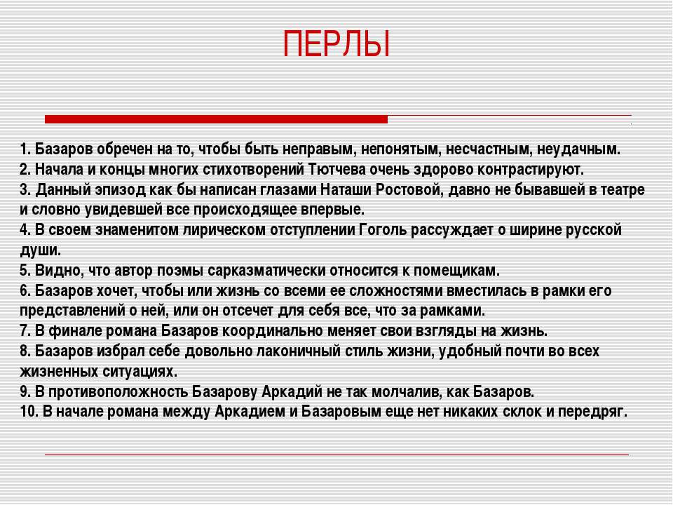 Текст слайда: ПЕРЛЫ 1. Базаров обречен на то, чтобы быть неправым, непонятым, несчастным, неудачным. 2. Начала и концы многих стихотворений Тютчева очень здорово контрастируют. 3. Данный эпизод как бы написан глазами Наташи Ростовой, давно не бывавшей в театре и словно увидевшей все происходящее впервые. 4. В своем знаменитом лирическом отступлении Гоголь рассуждает о ширине русской души. 5. Видно, что автор поэмы сарказматически относится к помещикам. 6. Базаров хочет, чтобы или жизнь со всеми ее сложностями вместилась в рамки его представлений о ней, или он отсечет для себя все, что за рамками. 7. В финале романа Базаров координально меняет свои взгляды на жизнь. 8. Базаров избрал себе довольно лаконичный стиль жизни, удобный почти во всех жизненных ситуациях. 9. В противоположность Базарову Аркадий не так молчалив, как Базаров. 10. В начале романа между Аркадием и Базаровым еще нет никаких склок и передряг.