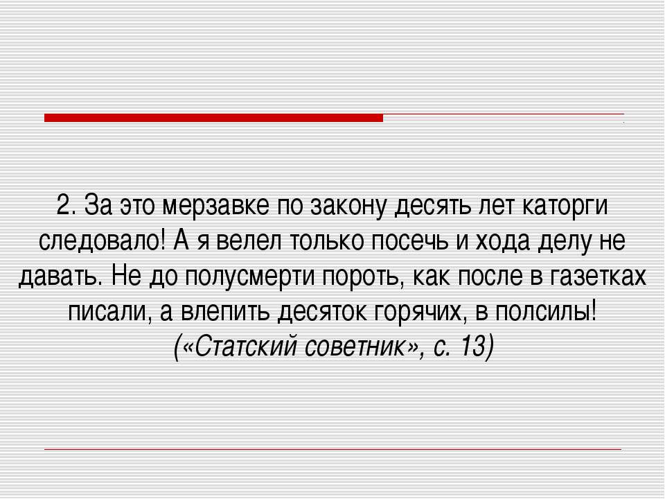 Текст слайда: 2. За это мерзавке по закону десять лет каторги следовало! А я велел только посечь и хода делу не давать. Не до полусмерти пороть, как после в газетках писали, а влепить десяток горячих, в полсилы! («Статский советник», с. 13)