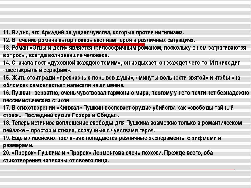 Текст слайда: 11. Видно, что Аркадий ощущает чувства, которые против нигилизма. 12. В течение романа автор показывает нам героя в различных ситуациях. 13. Роман «Отцы и дети» является философичным романом, поскольку в нем затрагиваются вопросы, всегда волновавшие человека. 14. Сначала поэт «духовной жаждою томим», он издыхает, он жаждет чего-то. И приходит «шестикрылый серафим». 15. Жить стоит ради «прекрасных порывов души», «минуты вольности святой» и чтобы «на обломках самовластья» написали наши имена. 16. Пушкин, вероятно, очень чувствовал гармонию мира, поэтому у него почти нет безнадежно пессимистических стихов. 17. В стихотворении «Кинжал» Пушкин воспевает орудие убийства как «свободы тайный страж… Последний судия Позора и Обиды». 18. Теперь истинное воплощение свободы для Пушкина возможно только в романтическом пейзаже – простор и стихия, созвучные с чувствами героя. 19. Еще в лицейских посланиях попадаются различные эксперименты с рифмами и размерами. 20. «Пророк» Пушкина и «Пророк» Лермонтова очень похожи. Прежде всего, оба стихотворения написаны от своего лица.