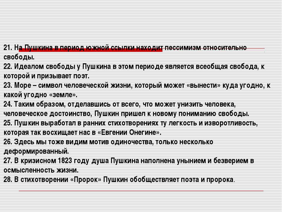 Текст слайда: 21. На Пушкина в период южной ссылки находит пессимизм относительно свободы. 22. Идеалом свободы у Пушкина в этом периоде является всеобщая свобода, к которой и призывает поэт. 23. Море – символ человеческой жизни, который может «вынести» куда угодно, к какой угодно «земле». 24. Таким образом, отделавшись от всего, что может унизить человека, человеческое достоинство, Пушкин пришел к новому пониманию свободы. 25. Пушкин выработал в ранних стихотворениях ту легкость и изворотливость, которая так восхищает нас в «Евгении Онегине». 26. Здесь мы тоже видим мотив одиночества, только несколько деформированный. 27. В кризисном 1823 году душа Пушкина наполнена унынием и безверием в осмысленность жизни. 28. В стихотворении «Пророк» Пушкин обобществляет поэта и пророка.
