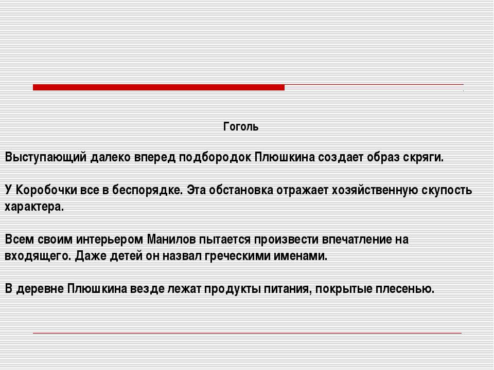 Текст слайда: Гоголь Выступающий далеко вперед подбородок Плюшкина создает образ скряги. У Коробочки все в беспорядке. Эта обстановка отражает хозяйственную скупость характера. Всем своим интерьером Манилов пытается произвести впечатление на входящего. Даже детей он назвал греческими именами. В деревне Плюшкина везде лежат продукты питания, покрытые плесенью.