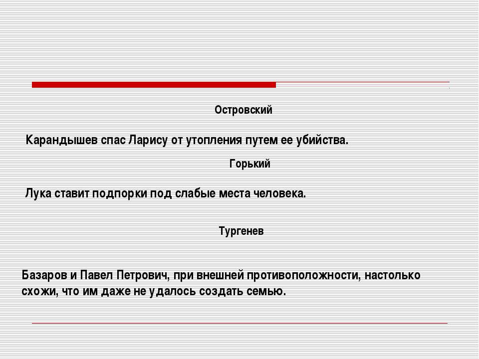 Текст слайда: Островский Карандышев спас Ларису от утопления путем ее убийства. Горький Лука ставит подпорки под слабые места человека. Тургенев Базаров и Павел Петрович, при внешней противоположности, настолько схожи, что им даже не удалось создать семью.