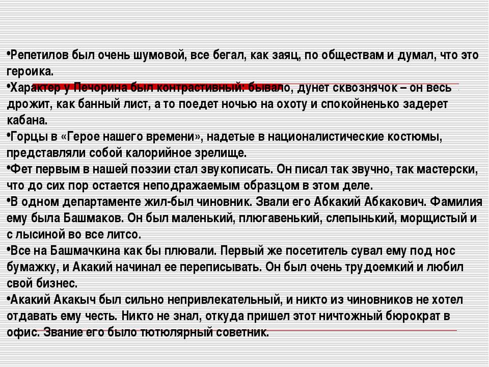 Текст слайда: Репетилов был очень шумовой, все бегал, как заяц, по обществам и думал, что это героика. Характер у Печорина был контрастивный: бывало, дунет сквознячок – он весь дрожит, как банный лист, а то поедет ночью на охоту и спокойненько задерет кабана. Горцы в «Герое нашего времени», надетые в националистические костюмы, представляли собой калорийное зрелище. Фет первым в нашей поэзии стал звукописать. Он писал так звучно, так мастерски, что до сих пор остается неподражаемым образцом в этом деле. В одном департаменте жил-был чиновник. Звали его Абкакий Абкакович. Фамилия ему была Башмаков. Он был маленький, плюгавенький, слепынький, морщистый и с лысиной во все литсо. Все на Башмачкина как бы плювали. Первый же посетитель сувал ему под нос бумажку, и Акакий начинал ее переписывать. Он был очень трудоемкий и любил свой бизнес. Акакий Акакыч был сильно непривлекательный, и никто из чиновников не хотел отдавать ему честь. Никто не знал, откуда пришел этот ничтожный бюрократ в офис. Звание его было тютюлярный советник.