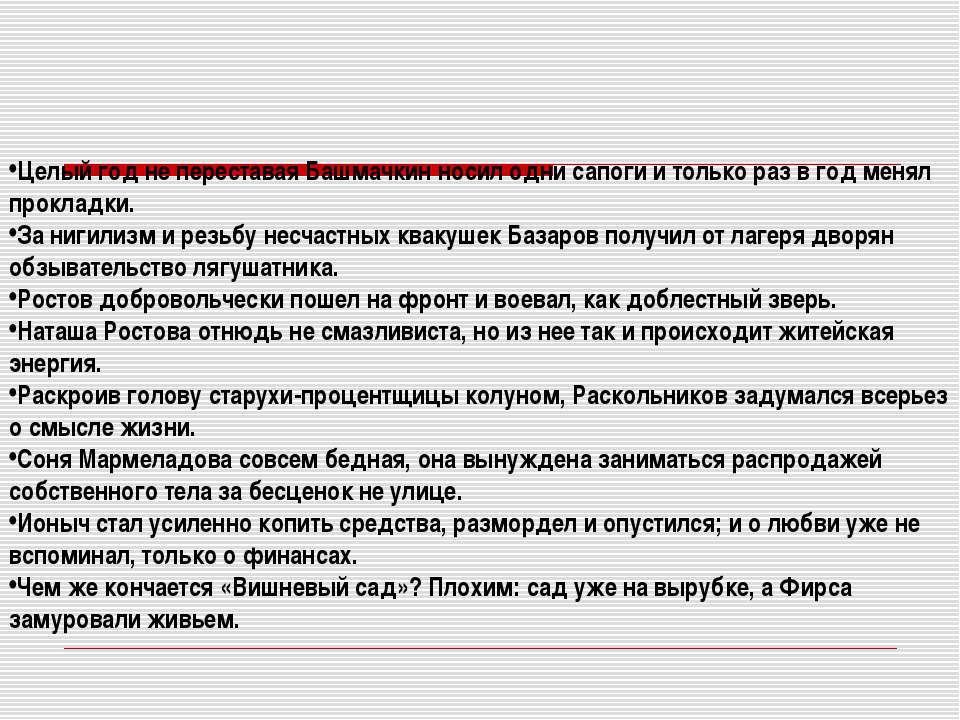 Текст слайда: Целый год не переставая Башмачкин носил одни сапоги и только раз в год менял прокладки. За нигилизм и резьбу несчастных квакушек Базаров получил от лагеря дворян обзывательство лягушатника. Ростов добровольчески пошел на фронт и воевал, как доблестный зверь. Наташа Ростова отнюдь не смазливиста, но из нее так и происходит житейская энергия. Раскроив голову старухи-процентщицы колуном, Раскольников задумался всерьез о смысле жизни. Соня Мармеладова совсем бедная, она вынуждена заниматься распродажей собственного тела за бесценок не улице. Ионыч стал усиленно копить средства, размордел и опустился; и о любви уже не вспоминал, только о финансах. Чем же кончается «Вишневый сад»? Плохим: сад уже на вырубке, а Фирса замуровали живьем.