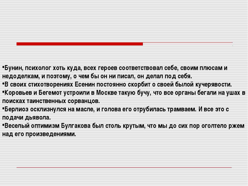 Текст слайда: Бунин, психолог хоть куда, всех героев соответствовал себе, своим плюсам и недоделкам, и поэтому, о чем бы он ни писал, он делал под себя. В своих стихотворениях Есенин постоянно скорбит о своей былой кучерявости. Коровьев и Бегемот устроили в Москве такую бучу, что все органы бегали на ушах в поисках таинственных сорванцов. Берлиоз осклизнулся на масле, и голова его отрубилась трамваем. И все это с подачи дьявола. Веселый оптимизм Булгакова был столь крутым, что мы до сих пор оголтело ржем над его произведениями.