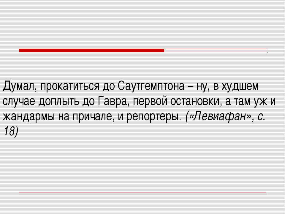 Текст слайда: Думал, прокатиться до Саутгемптона – ну, в худшем случае доплыть до Гавра, первой остановки, а там уж и жандармы на причале, и репортеры. («Левиафан», с. 18)