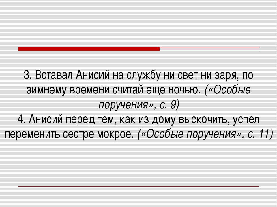 Текст слайда: 3. Вставал Анисий на службу ни свет ни заря, по зимнему времени считай еще ночью. («Особые поручения», с. 9) 4. Анисий перед тем, как из дому выскочить, успел переменить сестре мокрое. («Особые поручения», с. 11)