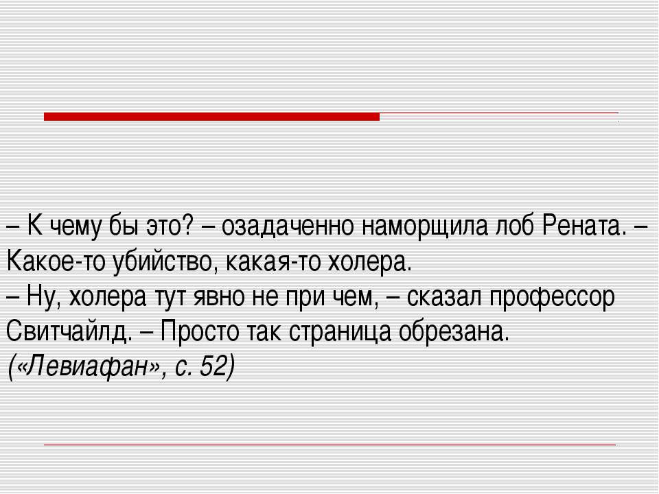 Текст слайда: – К чему бы это? – озадаченно наморщила лоб Рената. – Какое-то убийство, какая-то холера. – Ну, холера тут явно не при чем, – сказал профессор Свитчайлд. – Просто так страница обрезана. («Левиафан», с. 52)