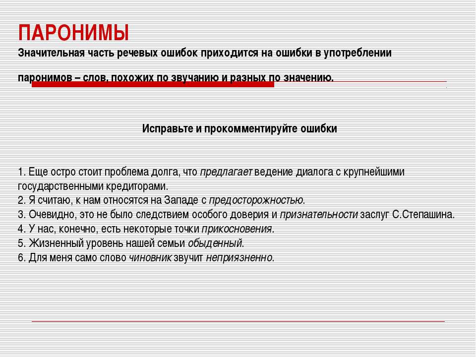 ПАРОНИМЫ Значительная часть речевых ошибок приходится на ошибки в употреблении паронимов – слов, похожих по звучанию и разных по значению. Исправьте и прокомментируйте ошибки 1. Еще остро стоит проблема долга, что предлагает ведение диалога с крупнейшими государственными кредиторами. 2. Я считаю, к нам относятся на Западе с предосторожностью. 3. Очевидно, это не было следствием особого доверия и признательности заслуг С.Степашина. 4. У нас, конечно, есть некоторые точки прикосновения. 5. Жизненный уровень нашей семьи обыденный. 6. Для меня само слово чиновник звучит неприязненно.