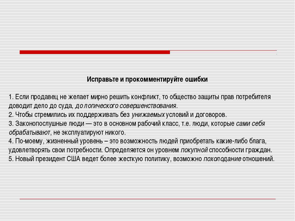 Текст слайда: Исправьте и прокомментируйте ошибки 1. Если продавец не желает мирно решить конфликт, то общество защиты прав потребителя доводит дело до суда, до логического совершенствования. 2. Чтобы стремились их поддерживать без унижаемых условий и договоров. 3. Законопослушные люди — это в основном рабочий класс, т.е. люди, которые сами себя обрабатывают, не эксплуатируют никого. 4. По-моему, жизненный уровень – это возможность людей приобретать какие-либо блага, удовлетворять свои потребности. Определяется он уровнем покупной способности граждан. 5. Новый президент США ведет более жесткую политику, возможно похолодание отношений.