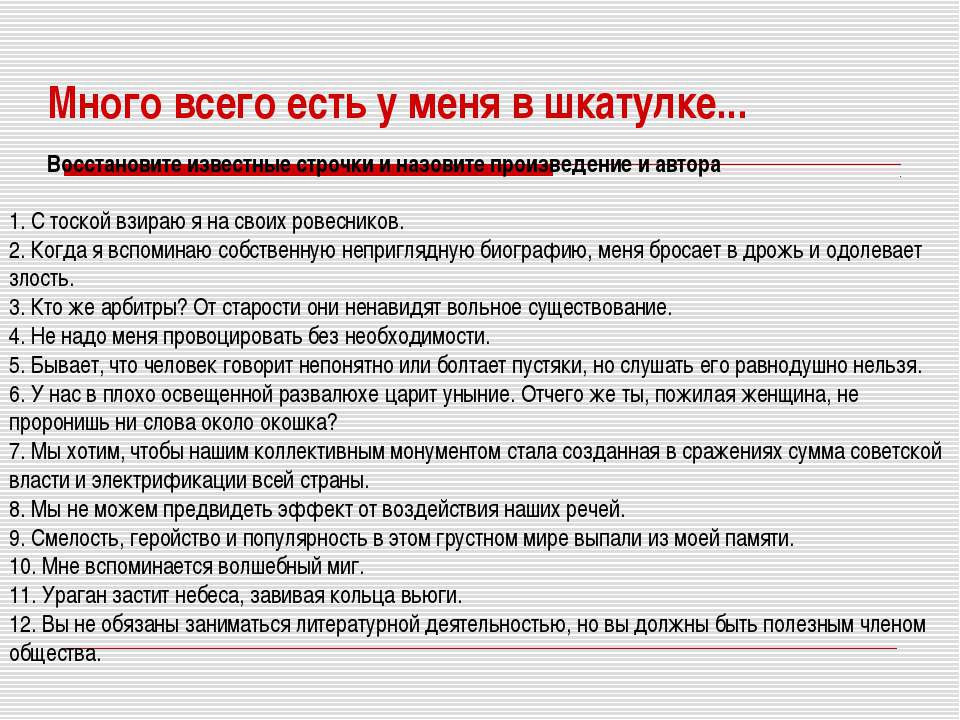 Текст слайда: Много всего есть у меня в шкатулке… Восстановите известные строчки и назовите произведение и автора 1. С тоской взираю я на своих ровесников. 2. Когда я вспоминаю собственную неприглядную биографию, меня бросает в дрожь и одолевает злость. 3. Кто же арбитры? От старости они ненавидят вольное существование. 4. Не надо меня провоцировать без необходимости. 5. Бывает, что человек говорит непонятно или болтает пустяки, но слушать его равнодушно нельзя. 6. У нас в плохо освещенной развалюхе царит уныние. Отчего же ты, пожилая женщина, не проронишь ни слова около окошка? 7. Мы хотим, чтобы нашим коллективным монументом стала созданная в сражениях сумма советской власти и электрификации всей страны. 8. Мы не можем предвидеть эффект от воздействия наших речей. 9. Смелость, геройство и популярность в этом грустном мире выпали из моей памяти. 10. Мне вспоминается волшебный миг. 11. Ураган застит небеса, завивая кольца вьюги. 12. Вы не обязаны заниматься литературной деятельностью, но вы должны быть полезным членом общества.