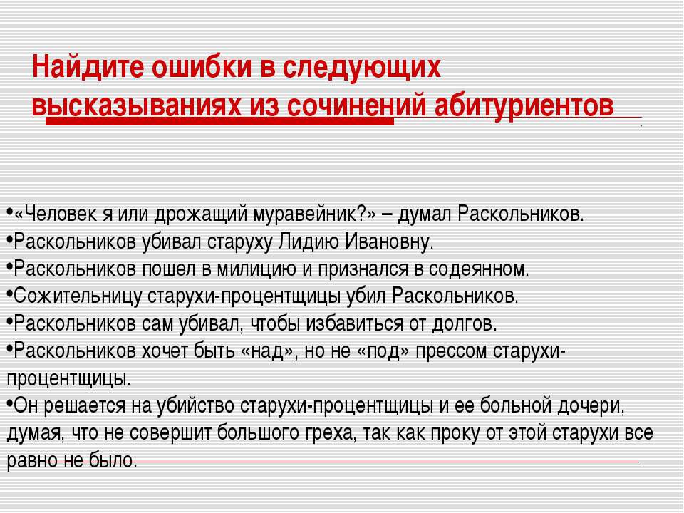 Найдите ошибки в следующих высказываниях из сочинений абитуриентов «Человек я или дрожащий муравейник?» – думал Раскольников. Раскольников убивал старуху Лидию Ивановну. Раскольников пошел в милицию и признался в содеянном. Сожительницу старухи-процентщицы убил Раскольников. Раскольников сам убивал, чтобы избавиться от долгов. Раскольников хочет быть «над», но не «под» прессом старухи-процентщицы. Он решается на убийство старухи-процентщицы и ее больной дочери, думая, что не совершит большого греха, так как проку от этой старухи все равно не было.