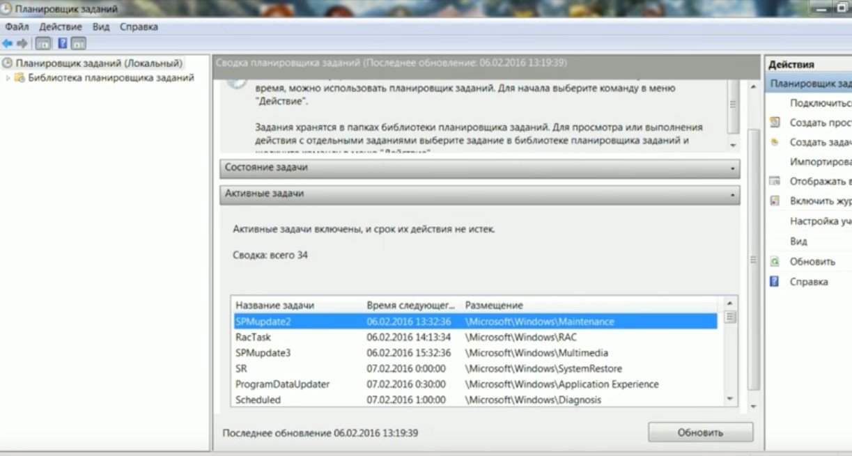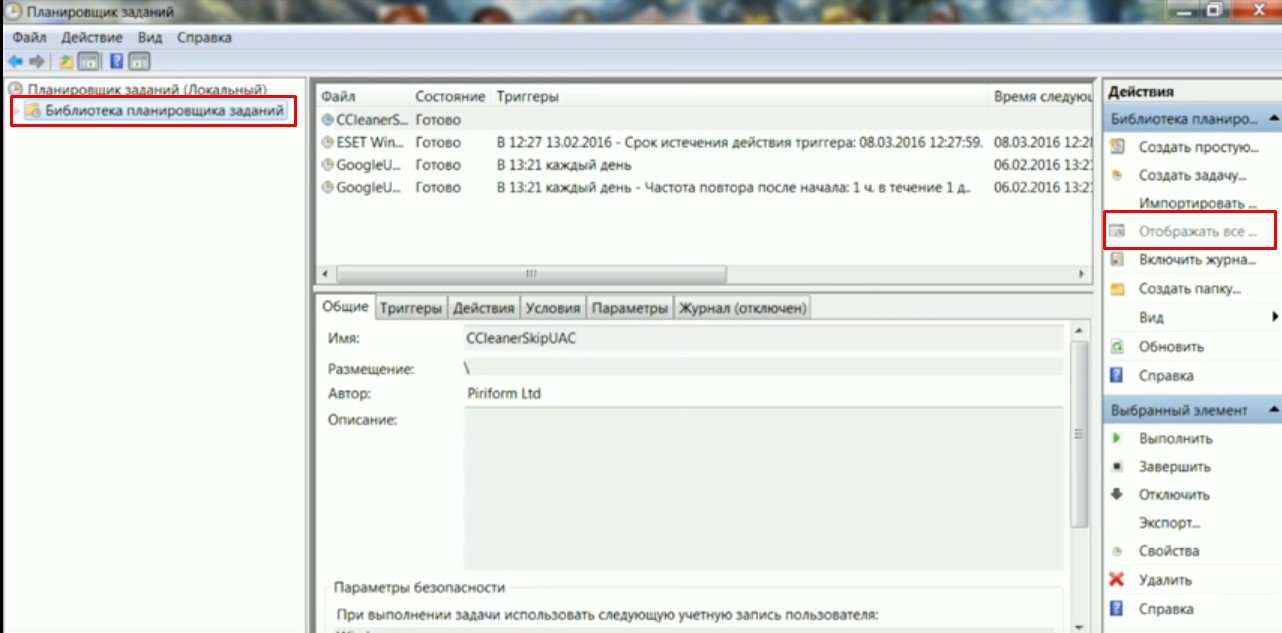 - Нажать на кнопку в левой колонке «Библиотека планировщика задач». В блоке «Действия» справа выбрать «Отобрать все выполняемые задачи».