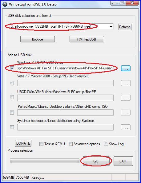 - Осталось нажать лишь кнопку GO, для того чтобы началась записываться загрузочная флешка WinSetupFromUSB. Как записать флешку, мы разобрались, теперь же перейдем к особой функции, которую предоставляет данная программа.