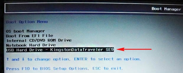 — ноутбук показал, что флешку видит (как и установленную на жестком диске Windows). Попробовал загрузиться с флешки.