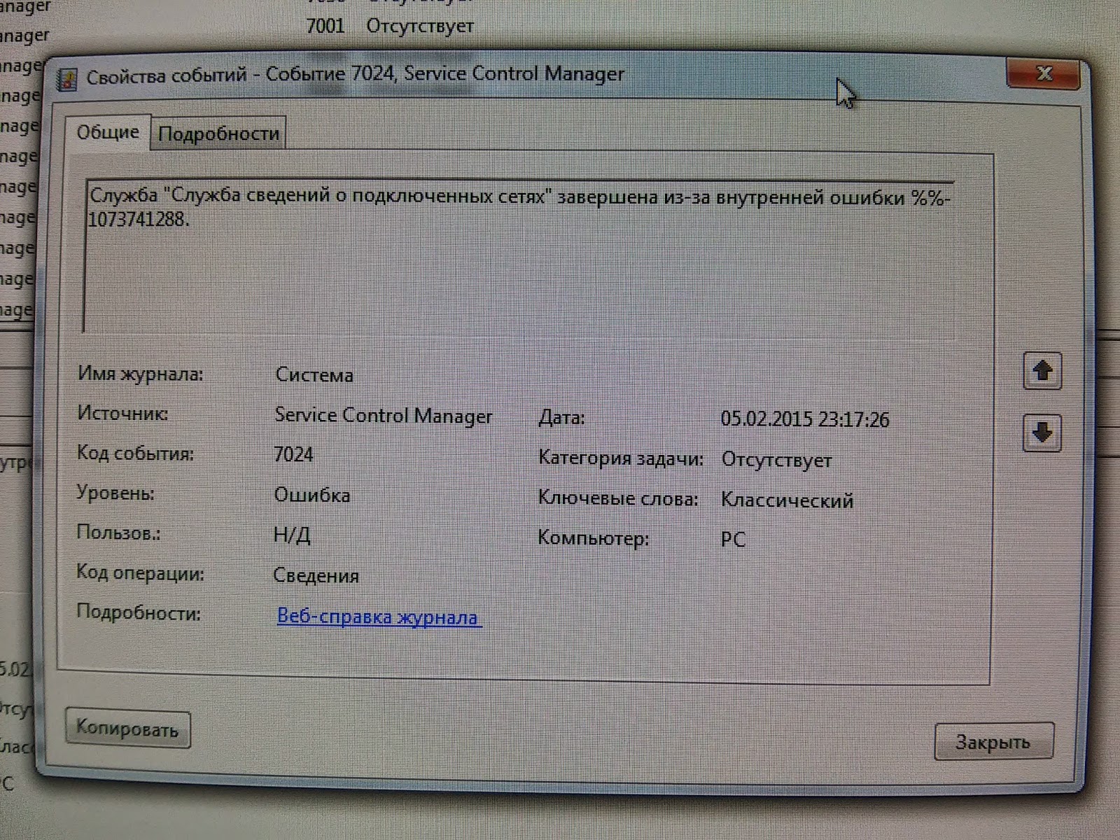 Служба «Служба сведений о подключенных сетях» завершена из-за внутренней ошибки %%-1073741288