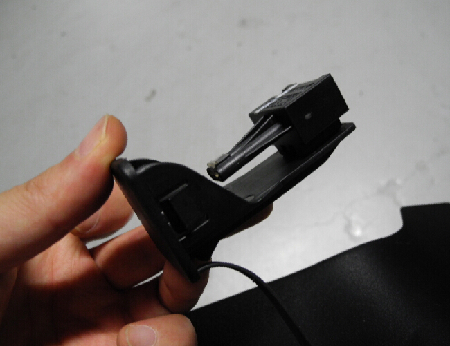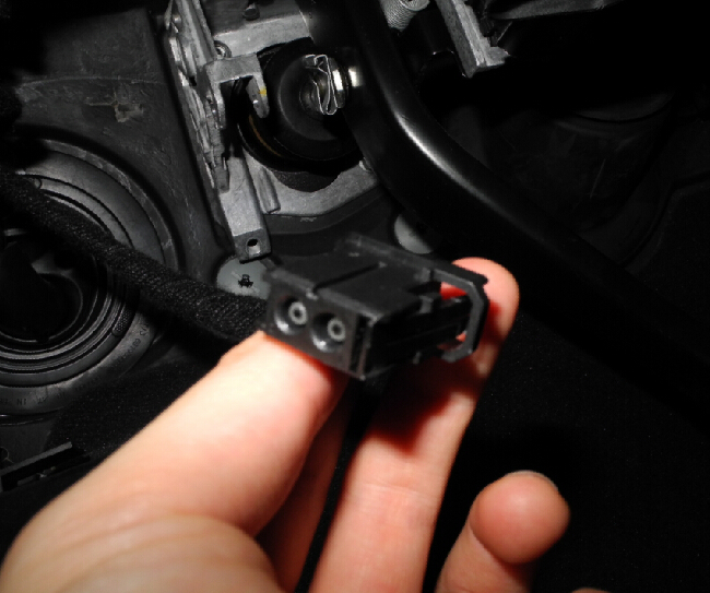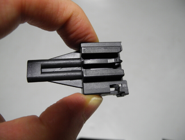 To use the MOST connector, you have to disconnect the ‘L’ shaped cover from the pointy adapter. To do this you have to first disconnect the MOST connector from the pointy adapter, then pry aside an arrow-head shaped hook on the pointy adapter while pushing it toward the pointy side. The pictures below will make it clear.