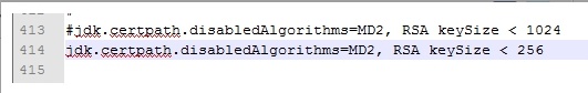 jdk.certpath.disabledAlgorithms=MD2, RSA keySize < 256