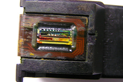 И так что же значит ошибка E28 для устройств начиная с MP140 и P08 начиная с MP240? Если не вдаваться в подробности — это означает перегрев одного из картриджей. Обычно в данных устройствах речь идет о цветном картридже, так как в нем намного чаще выгорают сопла чем в черном. Перед тем как объяснить почему это происходит хочу очень упрощенно рассказать о принципе термоструйной печати устройств Canon. Чернила попадают в сопла картриджа (трубки неразличимые невооруженным глазом). В соплах находятся термоэлементы которые нагревают чернила. При нагреве чернила выстреливают на бумагу. Чернила также выступают в роли охладителя. При отсутствии чернил термоэлементы нагреваются, происходит перегрев сопел и они разрушаются — выгорают. И так если устройство выдало данную ошибку то вам возможно повезло и сопла еще не успели выгореть. В таком случае рекомендуется сразу же заправить оба картриджа и запустить глубокую прочистку устройства, после чего распечатать тест-лист.