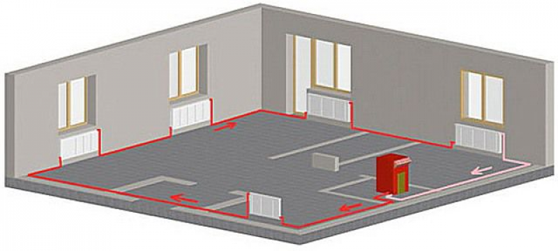 Подобная разводка радиаторов чаще всего применяется в одноэтажном строительстве – когда все батареи отопления расположены на одном уровне. При этом магистральная труба, закольцовывающая контур от котла, всегда размещена вдоль пола. Кстати, это дает возможность без особых хлопот расположить ее скрытно, задекорировав напольным покрытием.