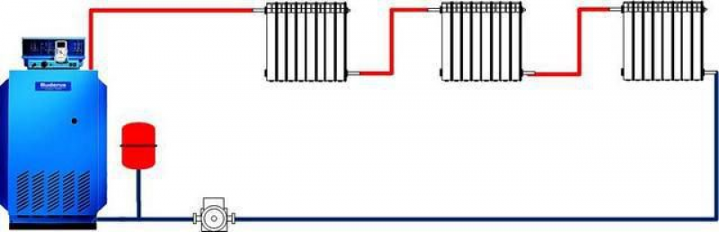 Такая система может работать как при естественной циркуляции (как показано на рисунке выше), так и с созданием принудительного перемещения теплоносителя (схема ниже). На схему размещения радиаторов отопления это особо не влияет.