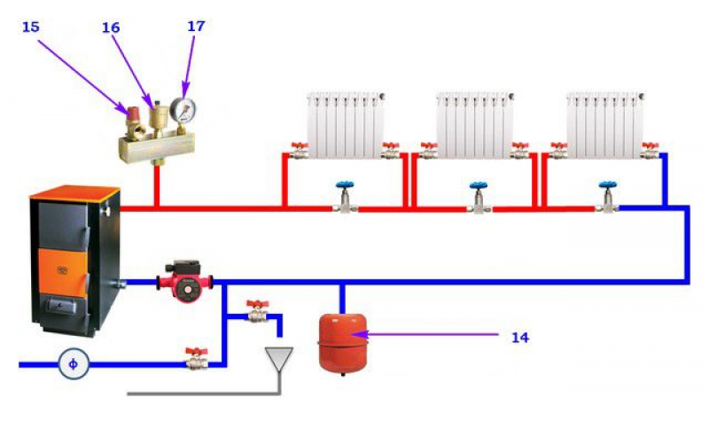 Для системы отопления закрытого типа обязательным условием является установка «группы безопасности». Монтируется этот блок в самой высокой точке контура, и включает, как правило, три обязательных элемента. Это предохранительный клапан, рассчитанный на определенную верхнюю границу давления (поз. 15), автоматического воздухоотводчика (поз. 16) и манометра (поз. 17) – для визуального контроля.