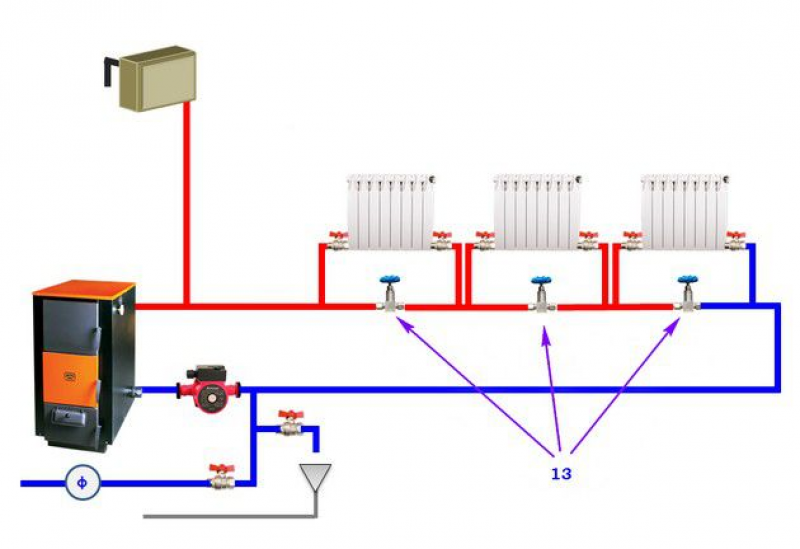 Д. Еще более широкие возможности по тонкой отладке «ленинградки» на каждом отдельно взятом ее участке предоставляет установка на байпасах регулировочных вентилей. На схеме они показаны под номером 13.