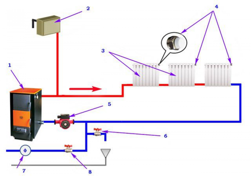 3 – радиаторы отопления. Какие будут установлены – с точки зрения системы отопления в данном случае значения не имеет. Выбор радиаторов отопления производится по несколько иным критериям – об этом на нашем портале опубликована отдельная статья.