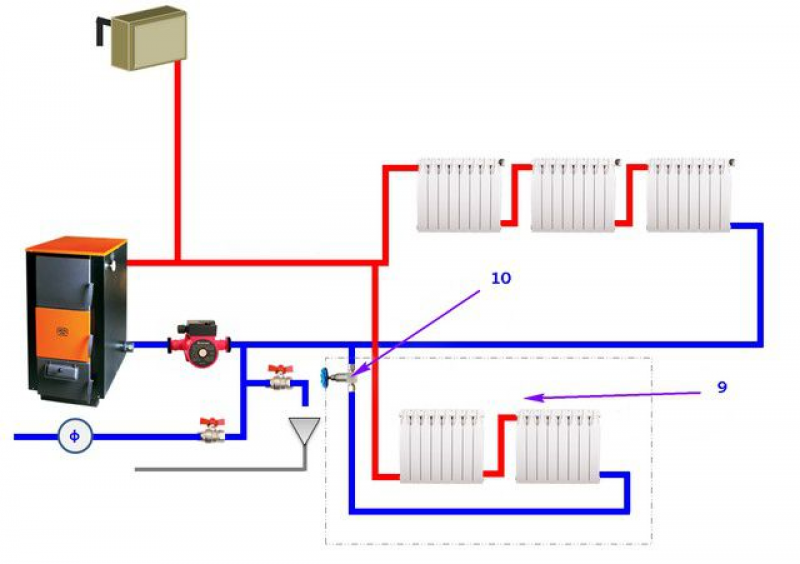 На схеме номер 9 показывает второй контур отопления, а позиция 10 – это регулировочный, точнее – балансировочный вентиль, с помощью которого обеспечивается необходимое распределение потока теплоносителя по двум «руслам».