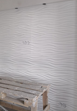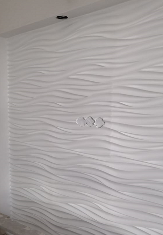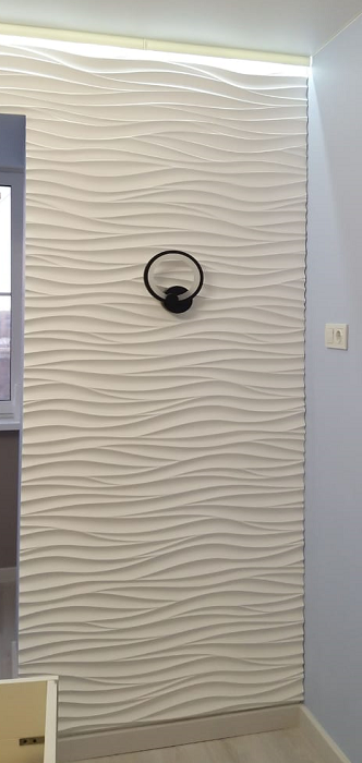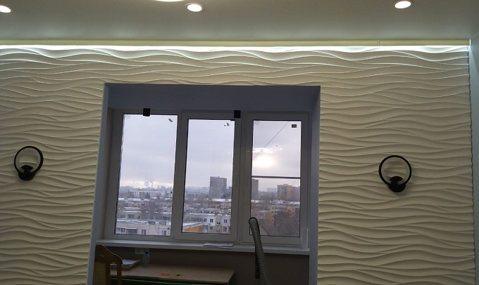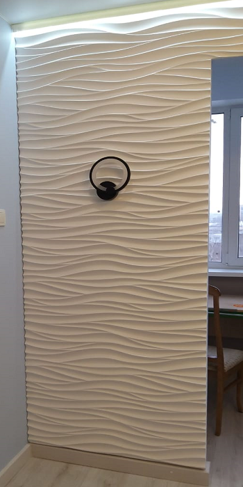 Для вкусного обеда мало купить свежих и качественных продуктов. Их нужно еще уметь правильно приготовить. Для роскошной и великолепной стены с 3D панелями мало просто купить у нас тонкие, прочные и очень качественные 3Д панели. Их нужно будет смонтировать со знаем дела, обладая необходимым опытом. На фото ниже показана самая распространенная ошибка при монтаже 3D панелей на стену. Сложно сказать – это стена изначально была неровная, или слой клея был такой, что 3Д панели удалось развернуть в плоскости, но факт остается фактом. 3D панели выложены не в одну плоскость и при боковом освещении хорошо видны ребра по швам. Будь эта стена напротив стены с окнами, то фронтальный ровный свет такой дефект бы и не выявил. Но в данном случае стена с 3D панелями примыкает к стене с окнами, поэтому свет получается боковой и все выдает.