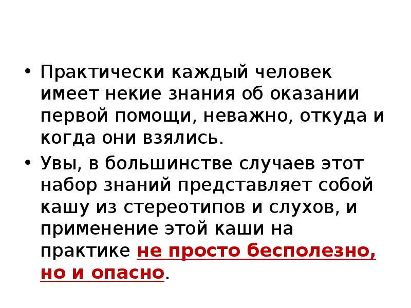 Практически каждый человек имеет некие знания об оказании первой помощи, неважно, откуда и когда они взялись. Увы, в большинстве случаев этот набор знаний представляет собой кашу из стереотипов и слухов, и применение этой каши на практике не просто бесполезно, но и опасно.