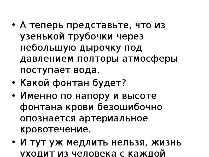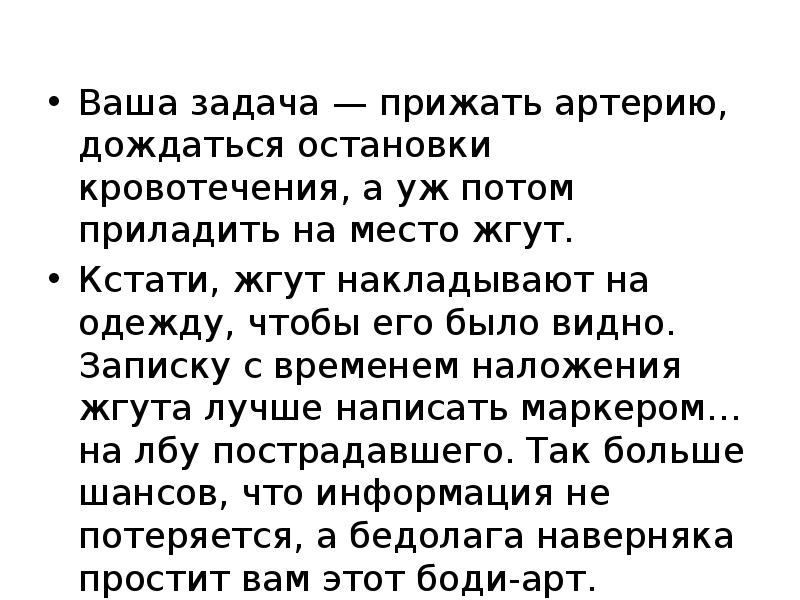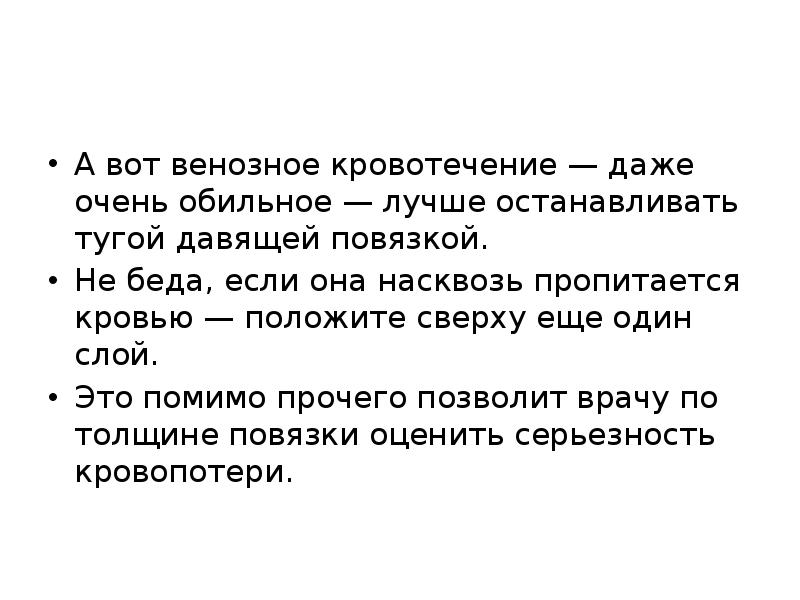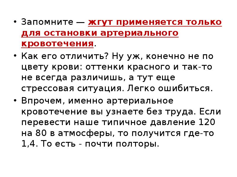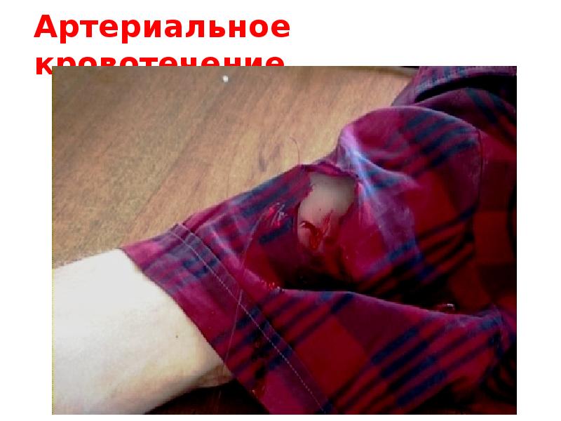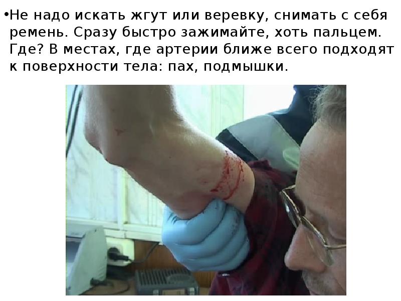 Артериальное кровотечение просто распознать, и вовсе не по цвету крови, как учили в школе. В артериях кровь бежит под давлением, поэтому из раны она не течет, а бьет как фонтан. Нужно НЕМЕДЛЕННО зажать артерию в паху или под мышкой и перетянуть конечность ближе к основанию жгутом или ремнем поверх одежды. При венозном кровотечении следует наложить давящую повязку, но не жгут, иначе есть риск необратимо обескровить конечность.