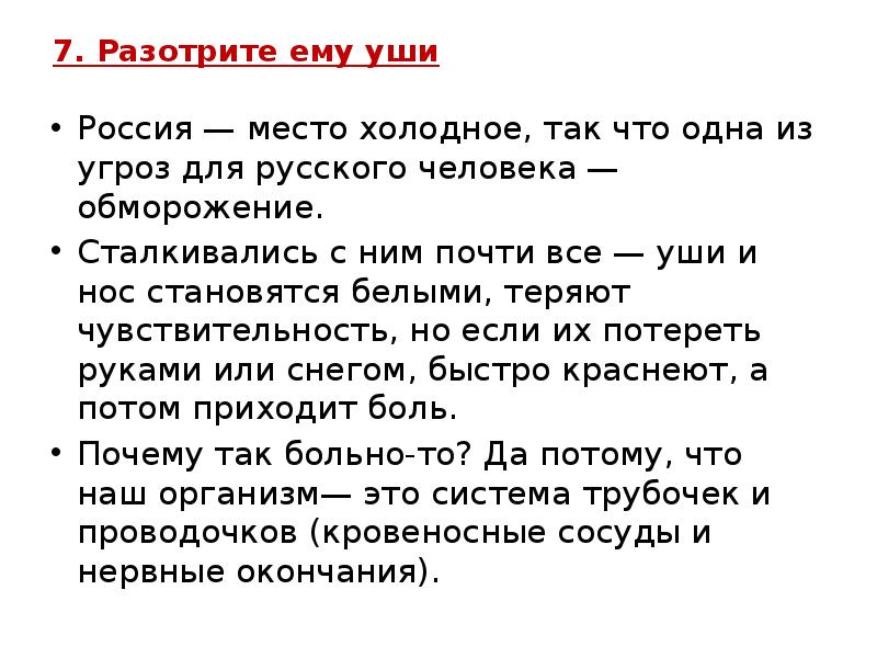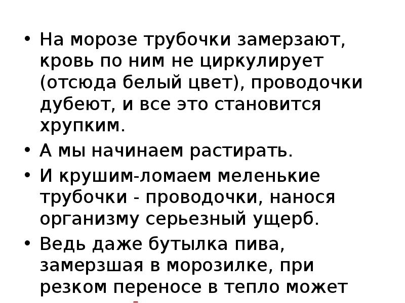 Если долго находиться на морозе, некоторые части тела могут замерзнуть и побелеть — уши, щеки, пальцы. Первое, что мы делаем, начинаем растирать побелевшее место. Это неправильно! От переохлаждения происходит спазм сосудов, кровоток в этой зоне ухудшается, а потом и совсем останавливается. Сосуды становятся «ломкими», и, растирая замерзшие участки кожи, мы наносим коже микротравмы, ломаем, повреждаем. В худшем случае, растирая, можем довести до омертвения замерзшие участки кожи.