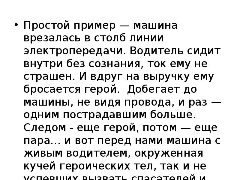 Сперва посмотрите, что угрожает вам, и лишь удостоверившись, что справитесь, оказывайте помощь. Например, если вы прикоснетесь к человеку, которого бьет током, пострадавших станет уже двое. В этом случае нужно отключить источник тока и/или деревянным предметом отодвинуть провод от человека.