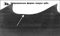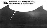 3а. Тут заметно, что при заточке заточной круг проходит неполный профиль зуба. Ошибка в установке угла наклона головки заточного станка или в профиле заточного камня, если не используется диск боразоновый абразивный круг. Кроме того, причина может быть в выработке эксцентрика заточного станка. Трещины появлялись в том месте, которое не было проточено.
