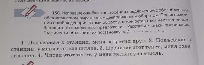 156. Исправьте ошибки в построении предложений с обособленными обстоятельством, выраженным деепричастным оборотом. При исправле. нии ошибок деепричастный оборот должен оставаться неизмененным Запишите исправленные предложения. Расставьте знаки препинания Графически объясните их постановку, х, /-.-.-.-1, … 1. Подъезжая к станции, меня встретил друг. 2. Подъезжая и станции, у меня слетела шляпа. 3. Прочитав этот текст, меня охва- тил гнев. 4. Читая этот текст, у меня мелькнула мысль.